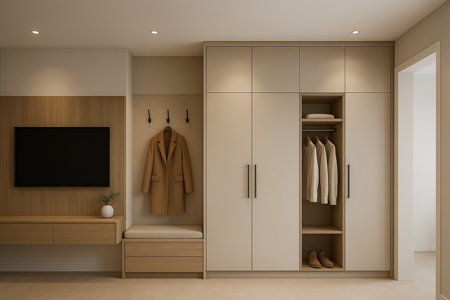 مشروع مستلمتنفيذ دواليب شاشة ومداخل ودواليب ملابس بتصميم عملي وتشطيبات أنيقة، مع تنظيم كامل للمتطلبات والقياسات