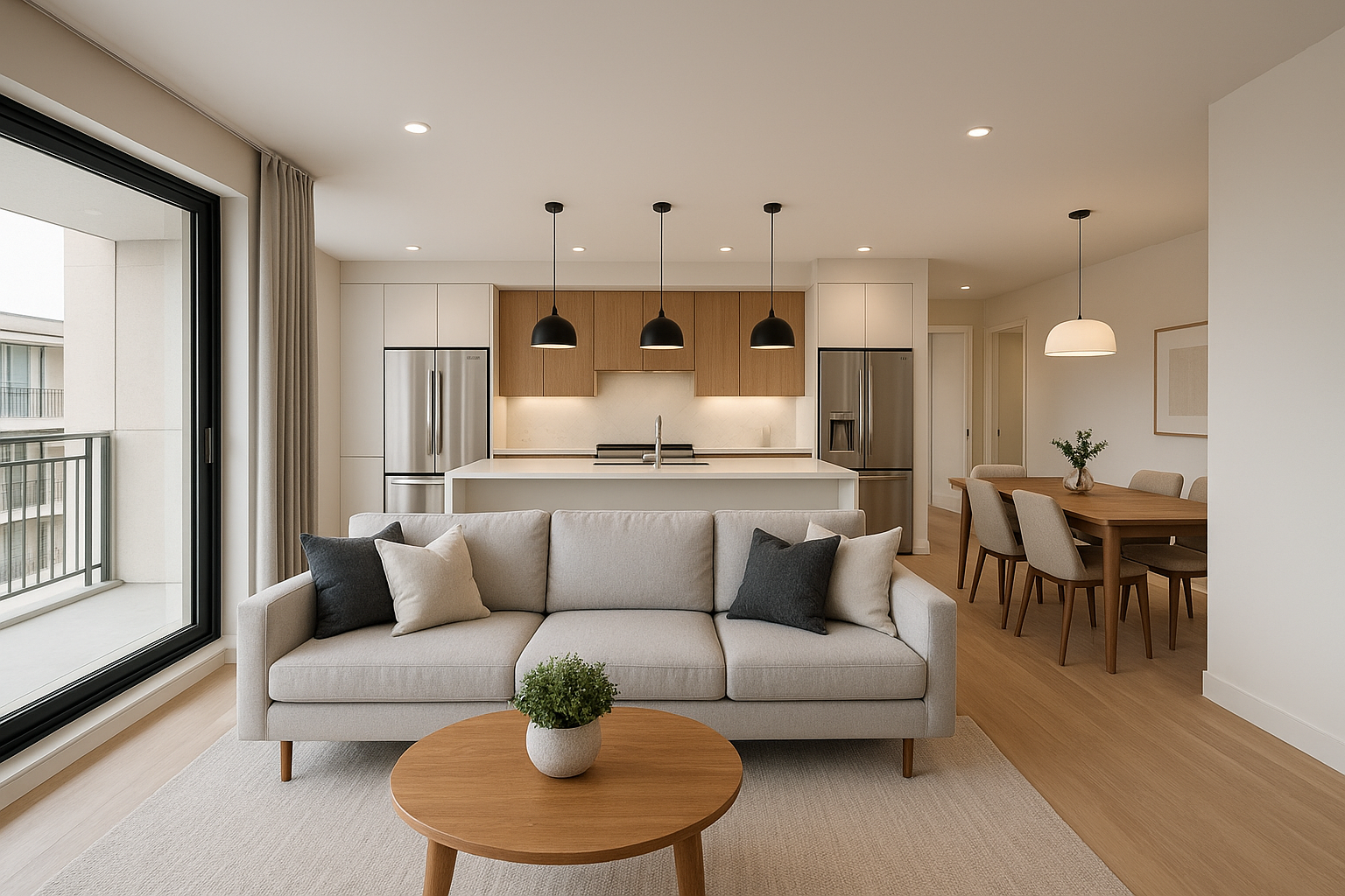 مشروع مستلمتصميم ديكور لصالة شقة في المنطقة الوسطى يشمل توزيع الأثاث والإضاءة والخامات، مع تنظيم متطلبات