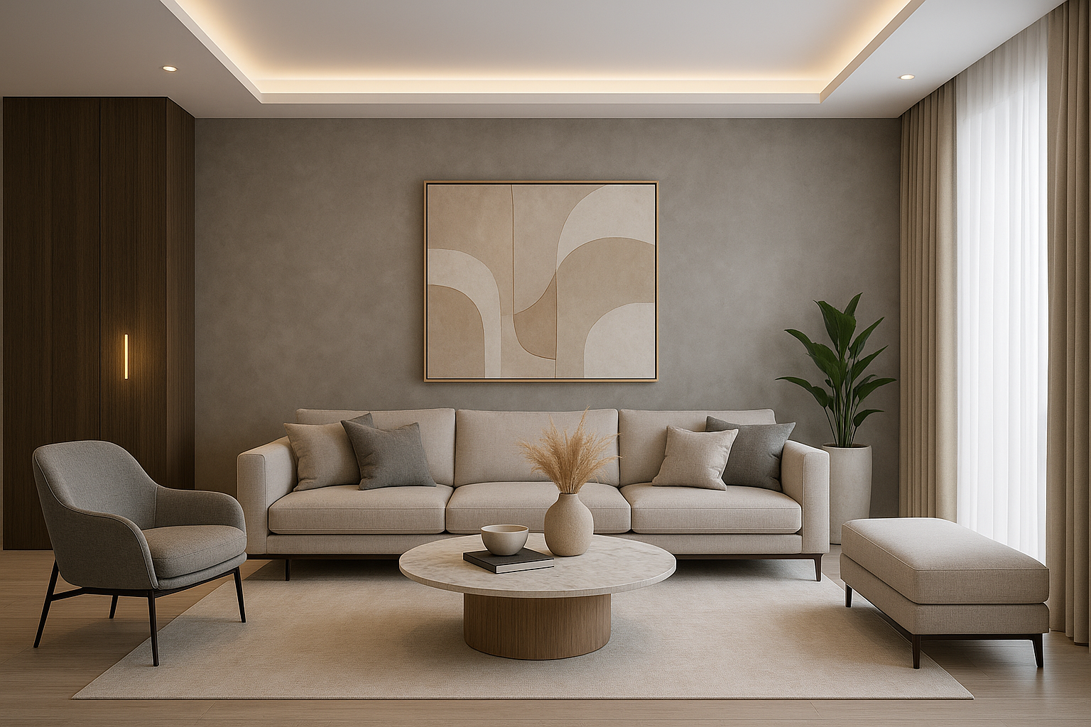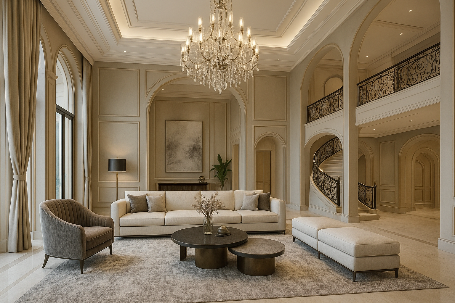 مشروع مستلمتصميم ديكور لصالة كبيرة مع توزيع أثاث مميز.