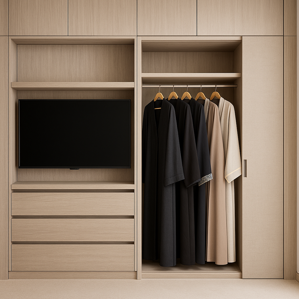 مشروع مستلممشروع ديكور شامل لتحسين تصميم غرفة نوم وخزائن ملابس.