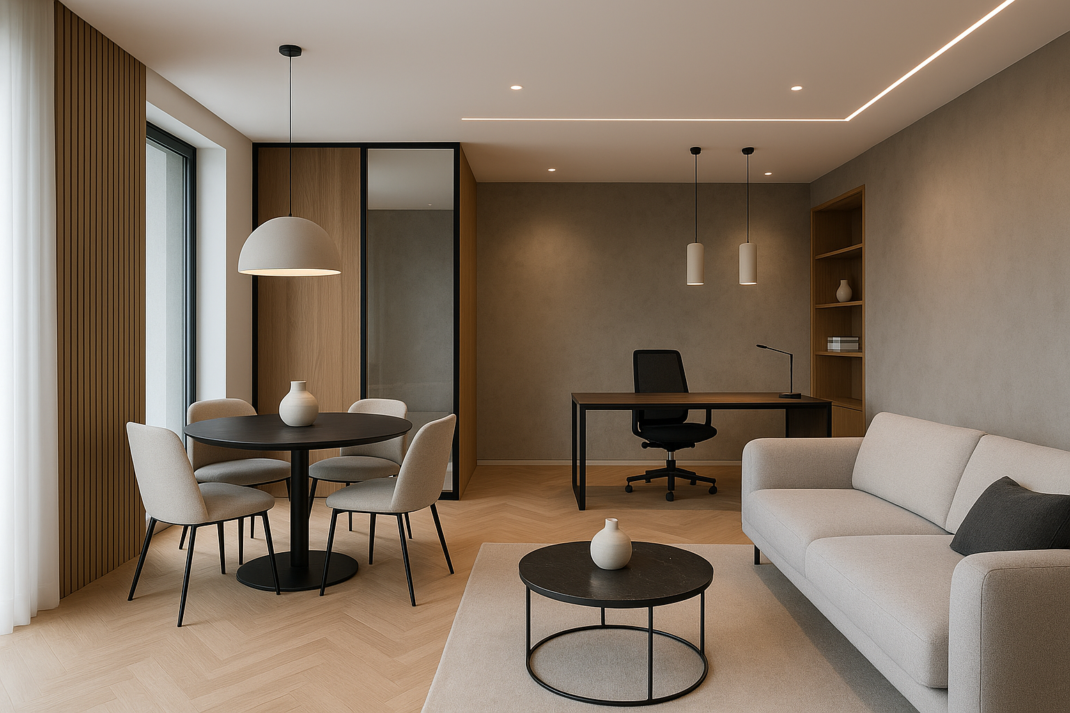مشروع مستلممشروع تشطيب يتضمن تصميم توزيعات الأثاث والبويات.